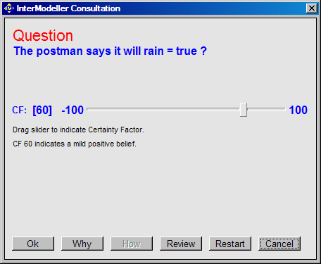 A model that contains one or more CF tags will be automatically run using a special CF logic mode, a variation of the normal method of depth-first backward chaining in which questions elicit certainty factor values from the user. A model (which could be a tree or table model) that contains no such tags can still be run in CF logic mode but this has to be selected by the user via the Run/Logic menu command. A rule which does not have any certainty factor tag is treated as 100% reliable.