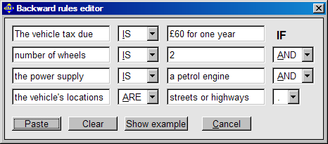 As an alternative to entering rules by typing directly into a rule window, you can select the rule editor from the Build menu. It provides a template for the syntax appropriate to the window.